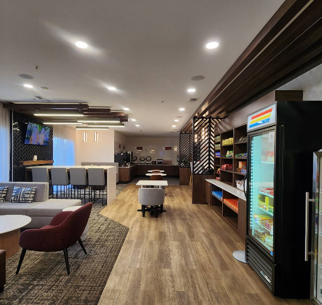 This project features custom millwork and cabinetry designed to enhance both functionality and aesthetics in key guest areas. Scope of work includes a sleek reception desk, a welcoming breakfast area, coffee station, and market shelving. Additional elements include a fully equipped business center, a decorative millwork screen in the lobby, and elegant louver ceilings above the communal table and registration area.